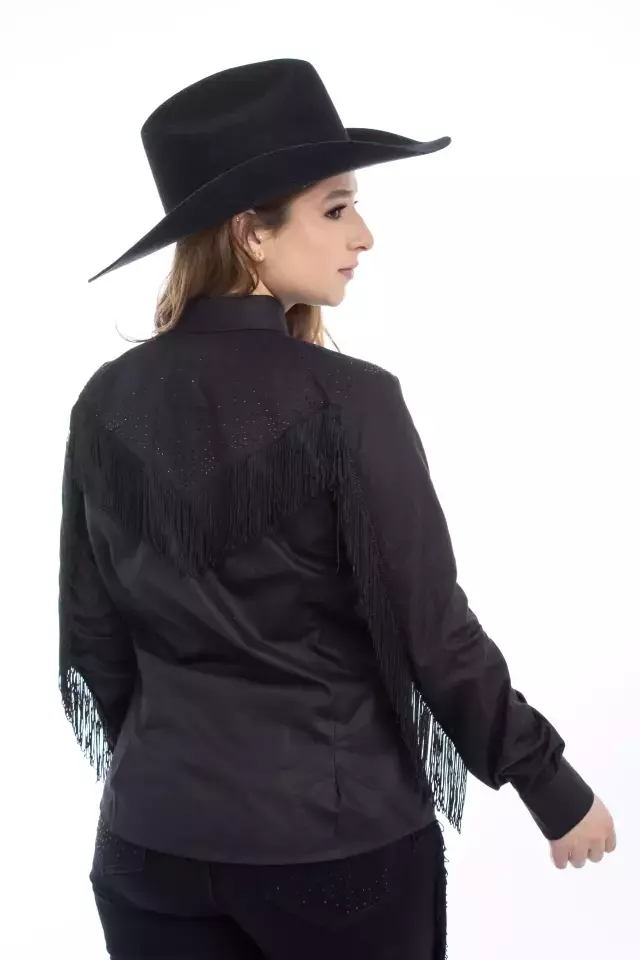 Com aplicação de strass e franjas na parte frontal e costas, a peça ganha brilho e movimento de forma única. As franjas se estendem até as mangas, criando um visual marcante e cheio de personalidade. O resultado é uma camisa impactante, perfeita para compor produções autênticas.