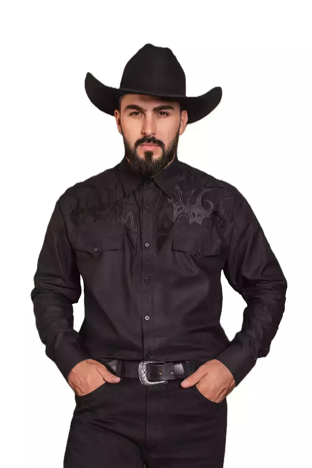 · 40101.065 - Camisa masc. preta, com bordado preto.